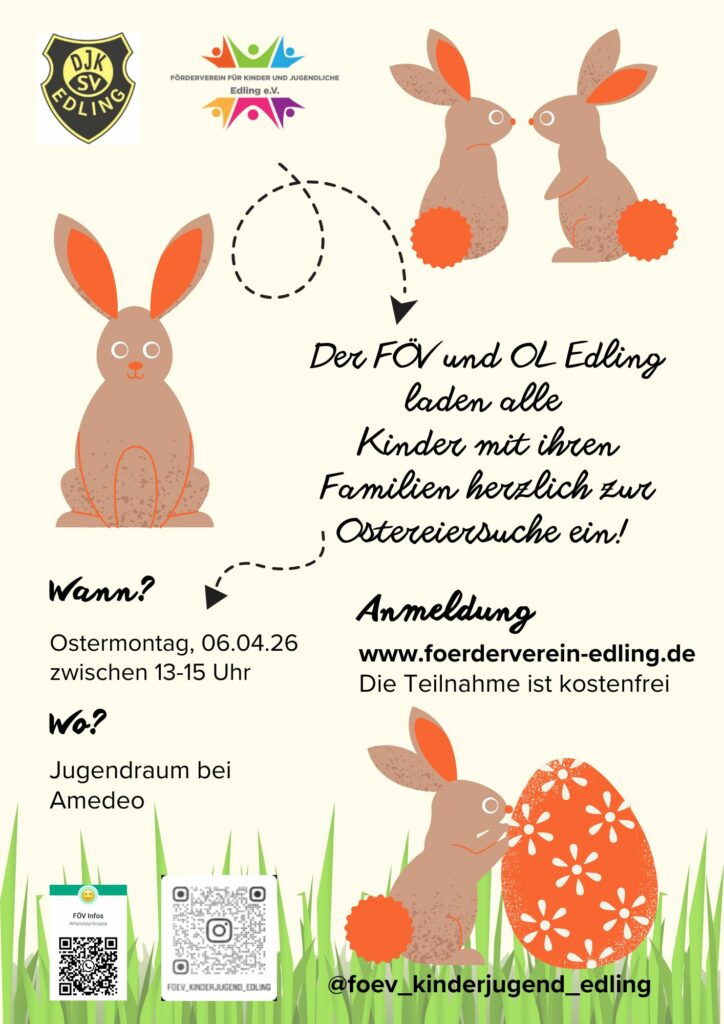 Der Förderverein in Zusammenarbeit mit der Abteilung Orientierungslauf des DJK-SV Edling lädt Euch und Eure ganze Familie herzlich zum Osterspaziergang mit Ostereiersuche am Montag, 06.04.2026 ein.